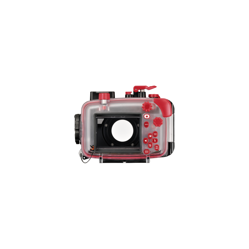 The Olympus PT-059 case for the Tough TG-6 is water resistant to 45m. It has a dual fiber optic support for external underwater flashes. The rear panel of the Ikelite case for TG-5 gives access to the screen and functions of the camera.