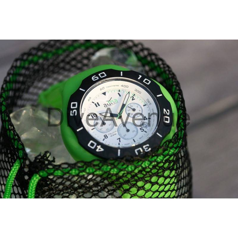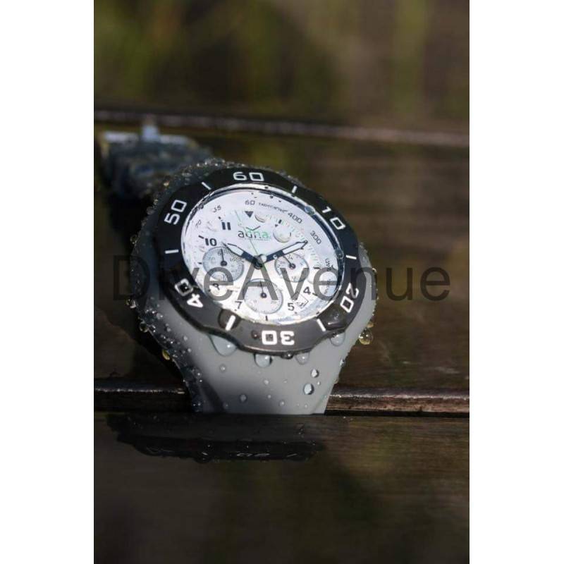 The watch ADNA CHRONO 51 white background is waterproof to 100m. It has a rotating scuba-type crown and an integrated chronograph.
