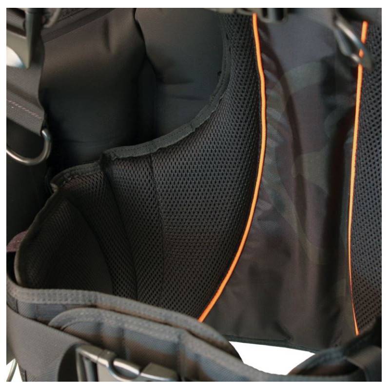 It has a rigid back-pack with a padded 3D foam shoulder, back and hip wrap.