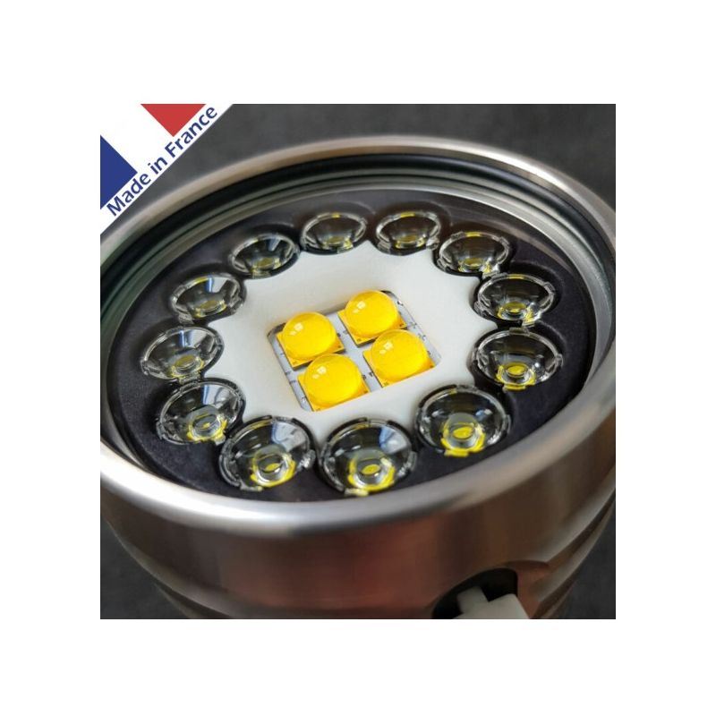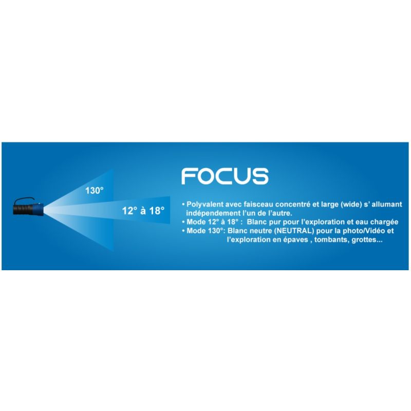 With two beam angles (18° and 130°) and two color temperatures (5000K and 5700K), the Focus EVO 10000 adjusts to your specific needs for every immersion. Its light output reaches 10000 lumens in wide mode and 9000 lumens in spot mode, guaranteeing optimum visibility in the most varied underwater environments.