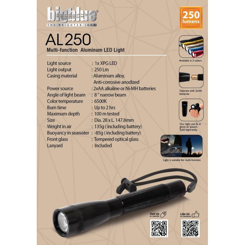 The Big blue AL250 beam angle is 8° and it is waterproof up to 100m. This small diving flashlight as a 2h battery duration and its dimensions are Ø28mm x L148mm.