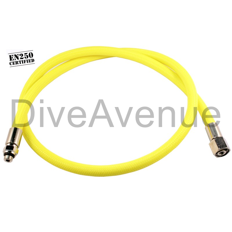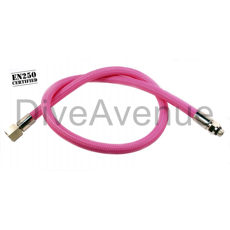 Braided nylon scuba regulator hose of 56cm length. Certified EN250. Several colors available to differentiate the regulators: black, yellow, blue, pink, green, red, carbon.