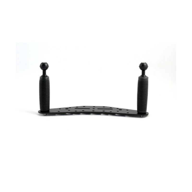 Carrying stand with double handle and ball joints. The bracket is made of anodized anticorodal aluminum, with holes for the handles and the case mounting. The bracket is supplied with 2 handles and with 25 mm flanges for the addition of arms or other accessories.