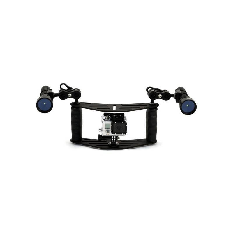 Double tray 25 made of anodised aluminium, with slots and holes for mounting handles and boxes. The top plate has a double function: the first is to protect the case from shocks and the second is to serve as a support for additional accessories. The double tray is complete with 2 IM / SF handles with ball joints. The GoPro adapter and the GoPro camera are not included.