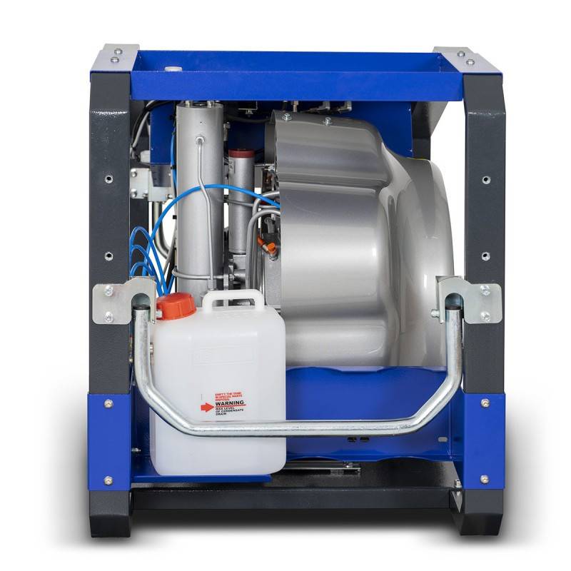 The welded frame of the ERGO range allows a good cooling flow and protects the user. The chassis integrates the electrical cabinet, the pressure gauges on the 3 stages, the oil level safety device, the ventilation air temperature safety device, the direction of rotation detector, the electric motor, the compressor block, the automatic bleeding and automatic stop system and the filtration system. Powder coated epoxy resin paint provides effective protection in hostile environments. Retractable carrying handles allow easy movement of the compressor for mobile applications.