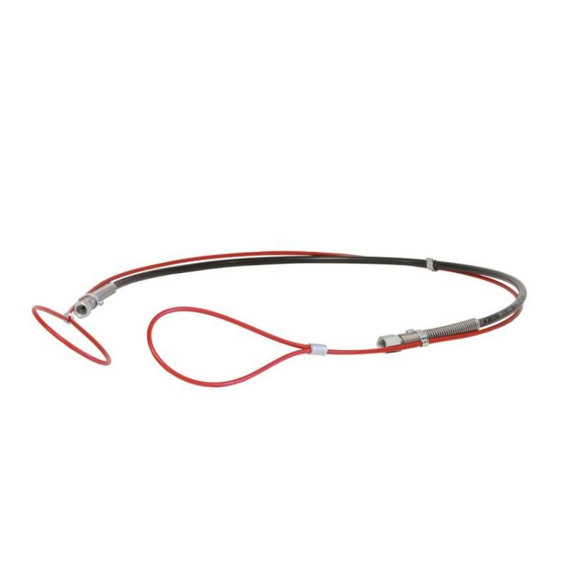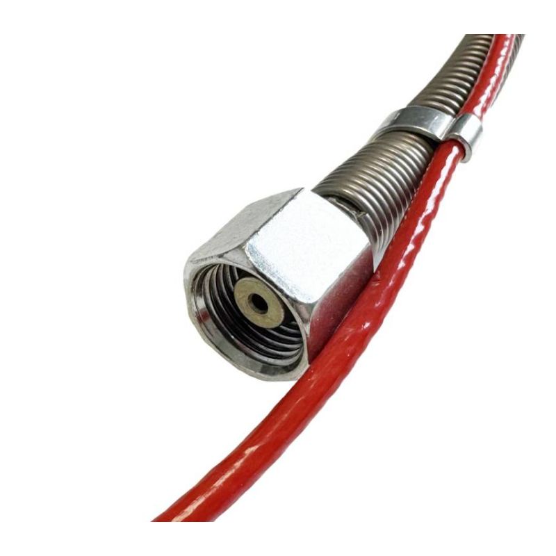 This BAUER high-pressure hose is made of braided Kevlar, an ultra-resistant material that allows it to withstand a service pressure of 500 bar and a burst pressure of up to 2000 bar. It is equipped with 316L stainless steel springs, sheathed steel anti-whip cable and strong carabiners, ensuring safe use.