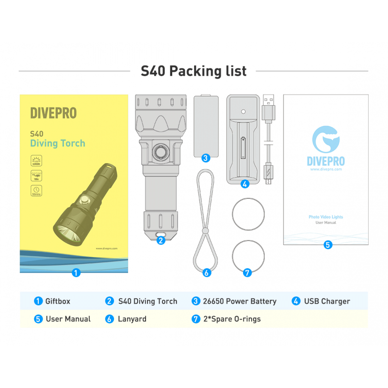 Waterproof to 100m, the DIVEPRO S40 video LED dive lamp is very compact with 128mm long and 33mm ofdiameter.