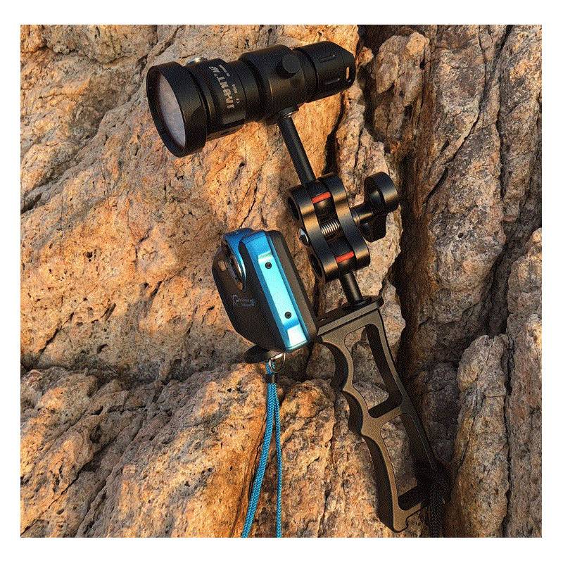 It has at the top a 25mm ball which allows to fix a DIVEPRO dive light or any other headlight using a clamp.