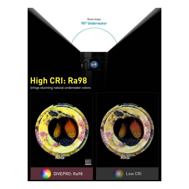The beam angle is 95° in water (140° in air). Its warm color temperature is 5000°K and its CRI Ra98, which is one of the highest color redering index of the scuba lights market and it will give back to the underwater videographer all the expected colors.