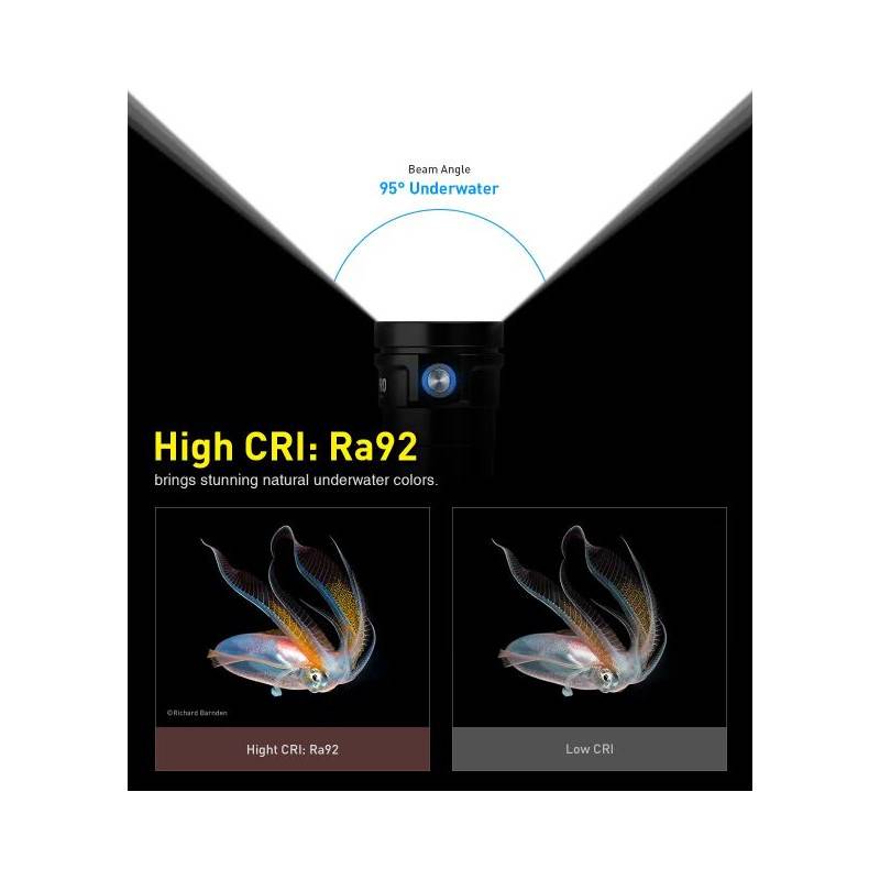 The beam angle is 95° in water (140° in air). Its warm color temperature is 5000°K and its CRI Ra92, and it will give back to the underwater videographer all the expected colors.
