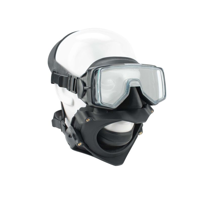 The mask frame and rigid components are made of impact resistant plastic. The face seal is made of high quality silicone that conforms to the diver's face. The modular removable mouthpiece is designed to be quickly swapped, allowing the diver multiple breathing gas options. The mask is also designed to accept various communication configurations.