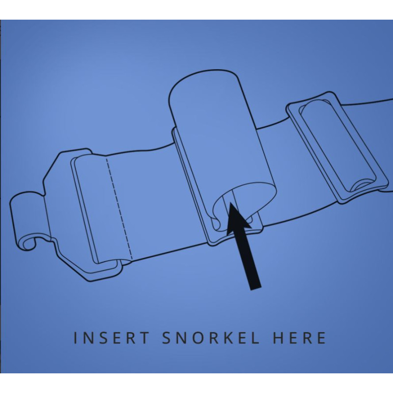 Once the strap is attached to your mask, take the second clip on the strap, pull a small section of the elastic strap through the loop to create a small loop large enough to pass your snorkel through and tighten it to secure it in place.