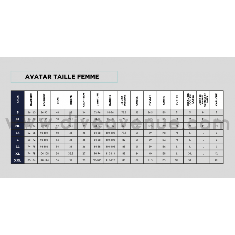 The SANTI AVATAR dry suit offers you a particularly detailed size guide. However, it should be noted that such a light AVATAR wetsuit with less than 3kg will allow you to go diving from warm seas with a very light underwear to much colder waters which will require a very thick underwear.