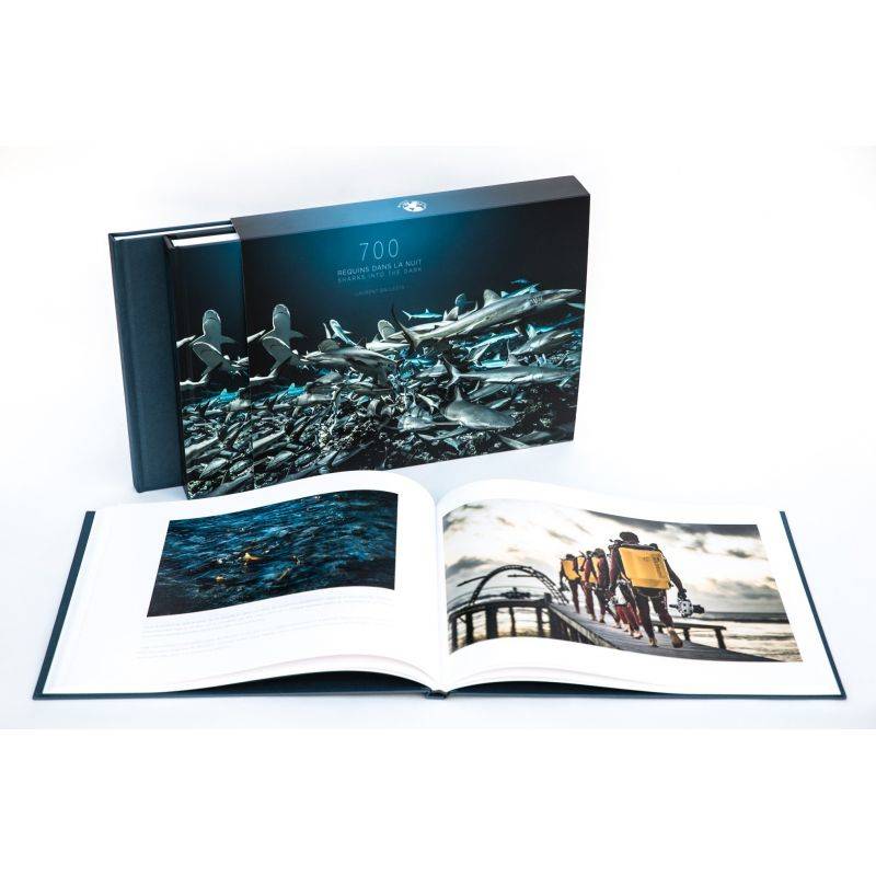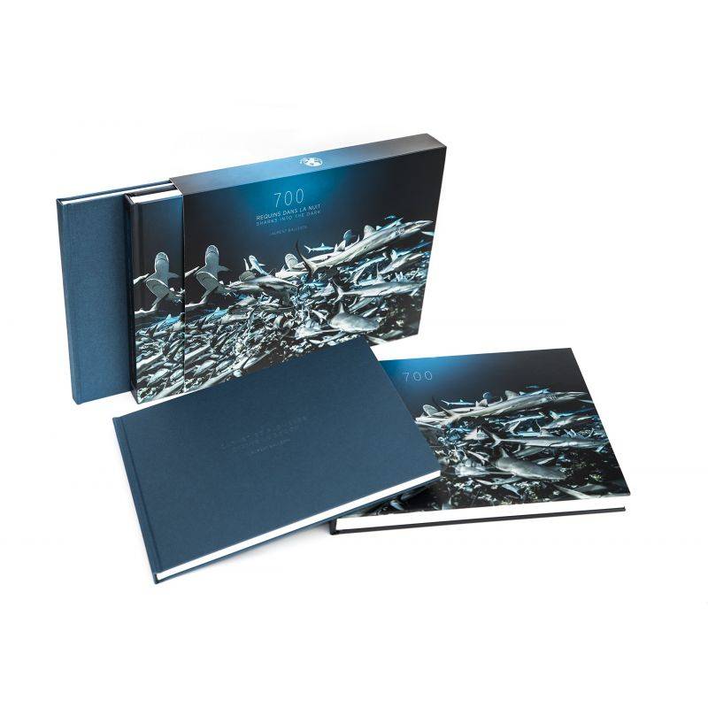 2 books in a slipcase: " 700 " photographic book of 180 pages " Logbook of dives " expedition book of 108 pages Editor's note: They are 700 say the scientists... but for Laurent Ballesta they are everywhere. The sharks block the narrow horizon with the beam of his lights, bump into his cameras, force their way between his fins. In this horde where everyone is determined to survive, the energy of the hungry reigns. When a prey is flushed out a pack forms and the chaos makes sense. Crazy choreographies are organized and end in a rain of scales. To say that they are ruthless would be to smile. They are predators from the depths of time. Four years of photographic work under the sign of the moon were necessary to compose this exceptional collection. It is a long term work for Laurent Ballesta to tame his own fear, to be accepted perhaps, and to finally reach the heart of this pack hidden in Fakarava, a preserved atoll in French Polynesia. The images he brings back from there are breathtaking of life, death, innocence and violence. That such a piece of wilderness can still exist reassures us, frightens us and dazzles us. This prodigy of animal life finally comes out of the shadows. This book reveals that the most dazzling of ballets is repeated endlessly, at the end of the world, at the end of the night and far from the circus of men.