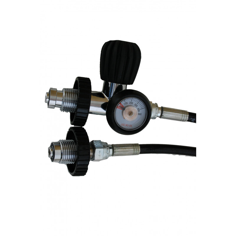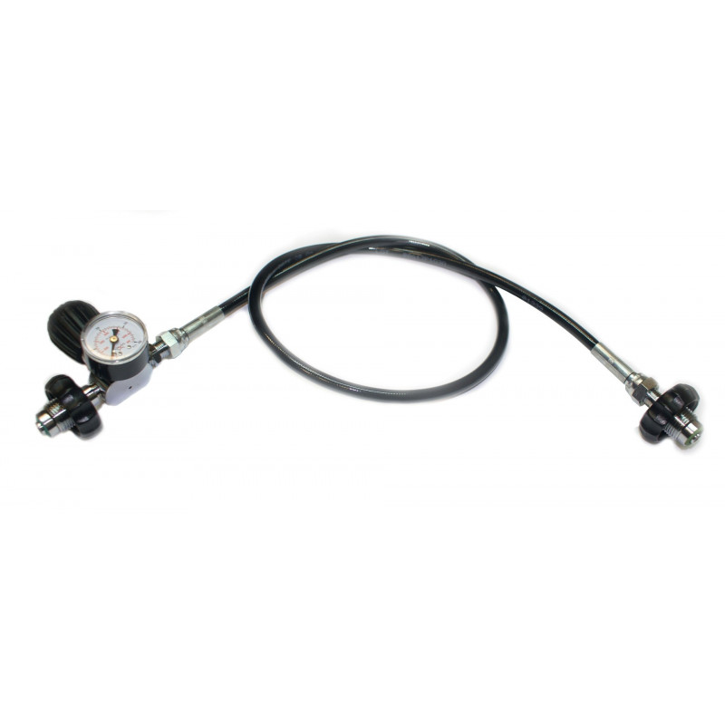 For a more easy use, we are selling a 300bar diving gas transfer hose with pressure gauge. DIN-DIN bar ends