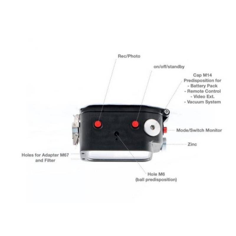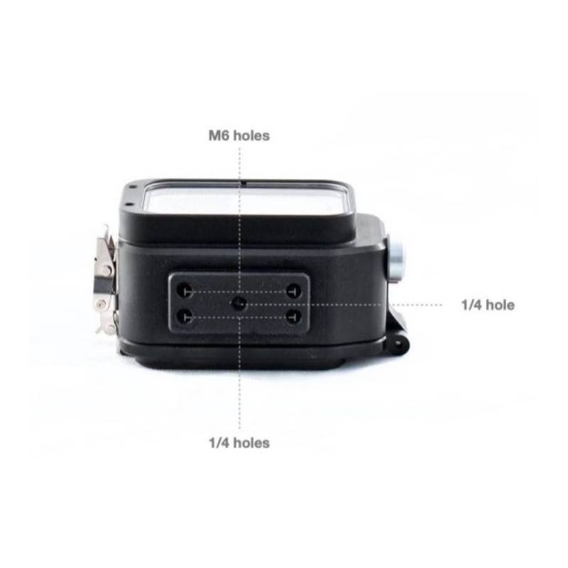 In the lower part the case is equipped with 5 threaded holes, 2 with metric pitch M6, 2 with Kodak pitch 1/4, which allows you to easily fix the case to a possible tilt bracket. There is a central Kodak pitch hole 1/4.