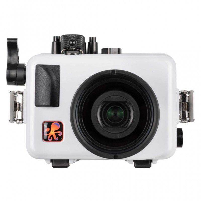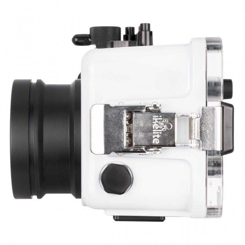 Newly designed housing in gray polycarbonate with transparent rear door for checking the correct position of the camera body and control levers inside the housing; highly resistant, it is tested and usable up to a depth of 60 meters. The specially formulated gray color reflects the sun's rays to keep the camera cooler over time. Compared with black or transparent housings, the gray color offers superior contrast for better viewing of the LCD screen.