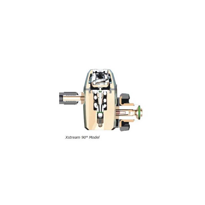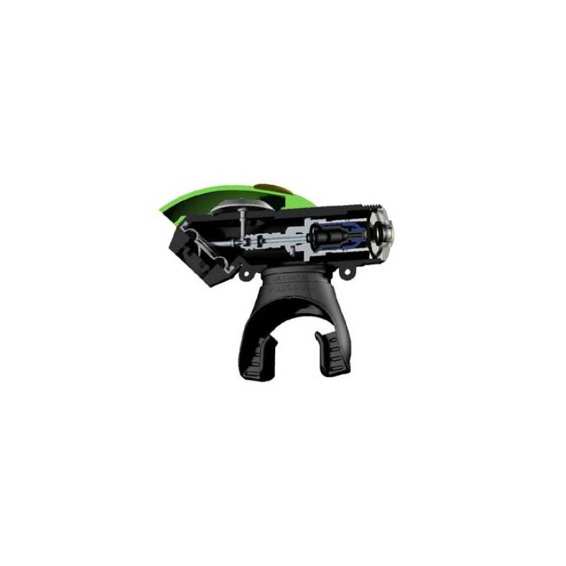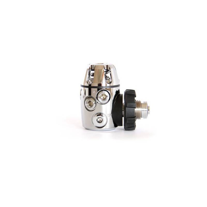 Its XStream first stage has two patents. Firstly, the seat is made from a balanced diaphragm ball valve, which produces a constant pressure of up to 16bar in the cylinder! It is also equipped with thermal insulation on the upper part (TDA - Thermodynamic Anti-Freeze) - see photo - which insulates the lower part of the regulator in the event of continuous flow. This valve passed the tests at 0° with continuous flow for 10 minutes without malfunctioning. It's a regulator that's particularly well suited to cold water.