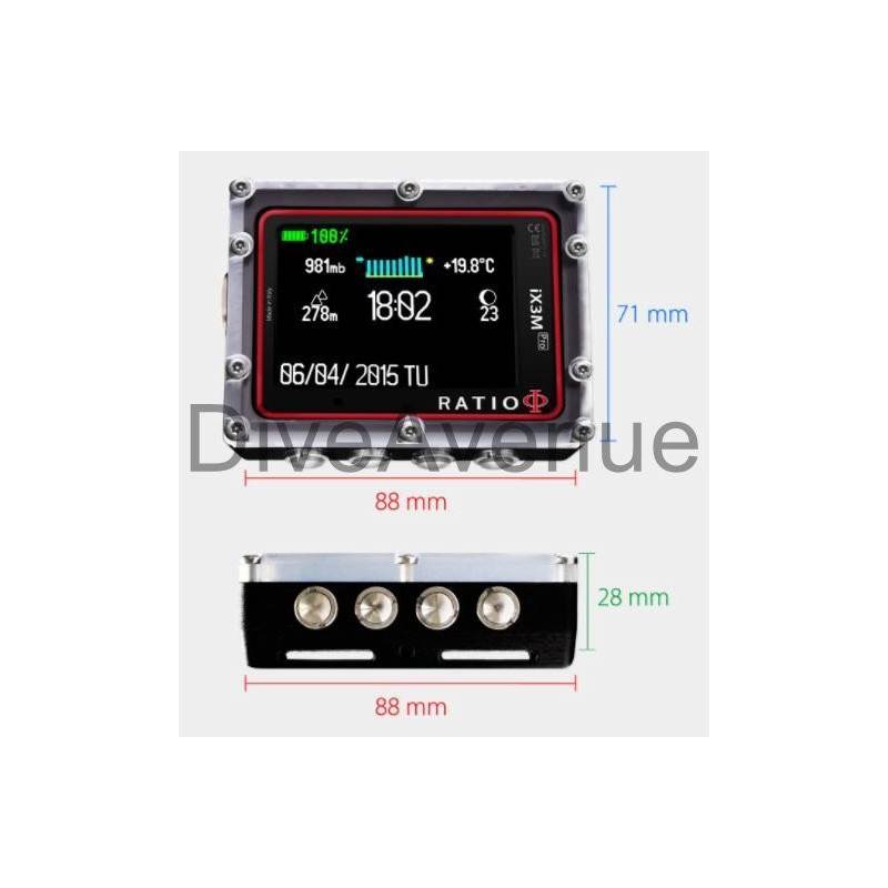 The Ratio IX3M [Pro] Deep also includes a color screen customization, a compass (usable under water) with distance, weather forecasting, magnetometer, light meter, altimeter , barometer, stopwatch, variometer ....