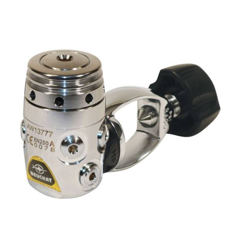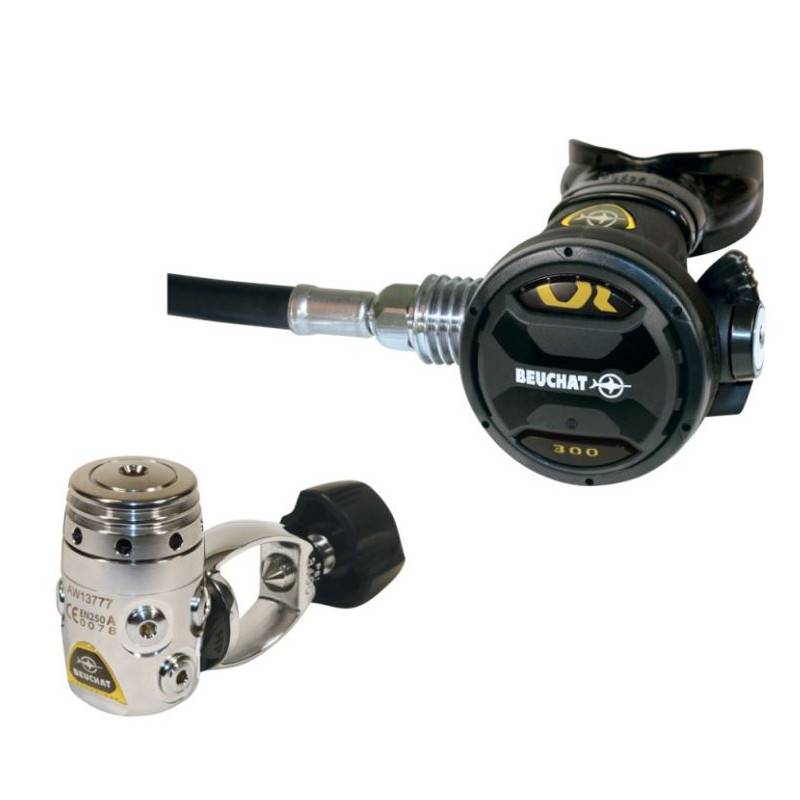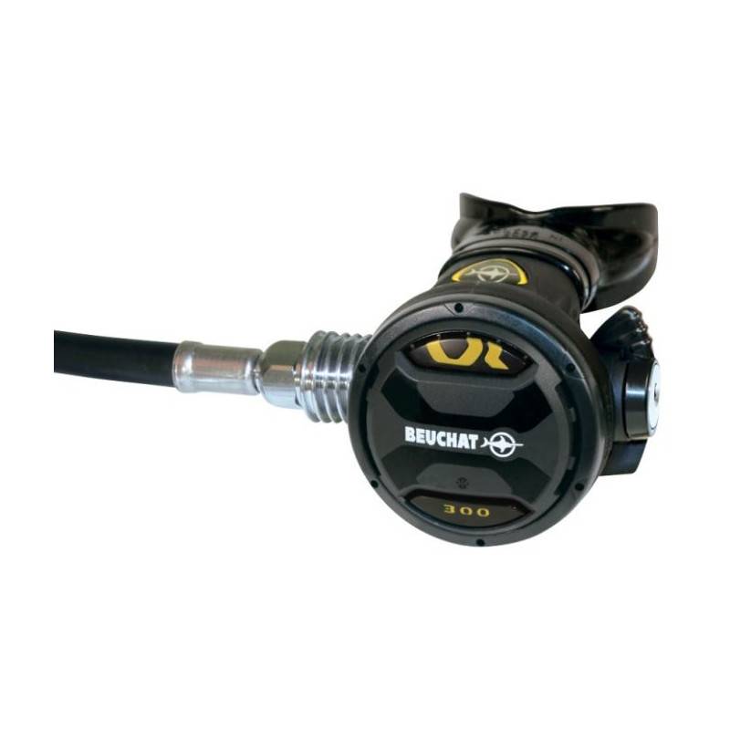 The VR 300 is a premium regulator that offers a combination of advanced technology, exceptional cold resistance and elegant design. Like all Beuchat regulators, it is manufactured in France at their factory and then individually tested and adjusted on a specialised hyperbaric bench. The regulator features a compensated diaphragm first stage with a bright chrome body, as well as a compensated downstream valve type second stage with an adjustable Venturi and a soft bonnet with a large purge area. It also has 2 HP and 4 MP outlets and its MP hose has a PU outer jacket.