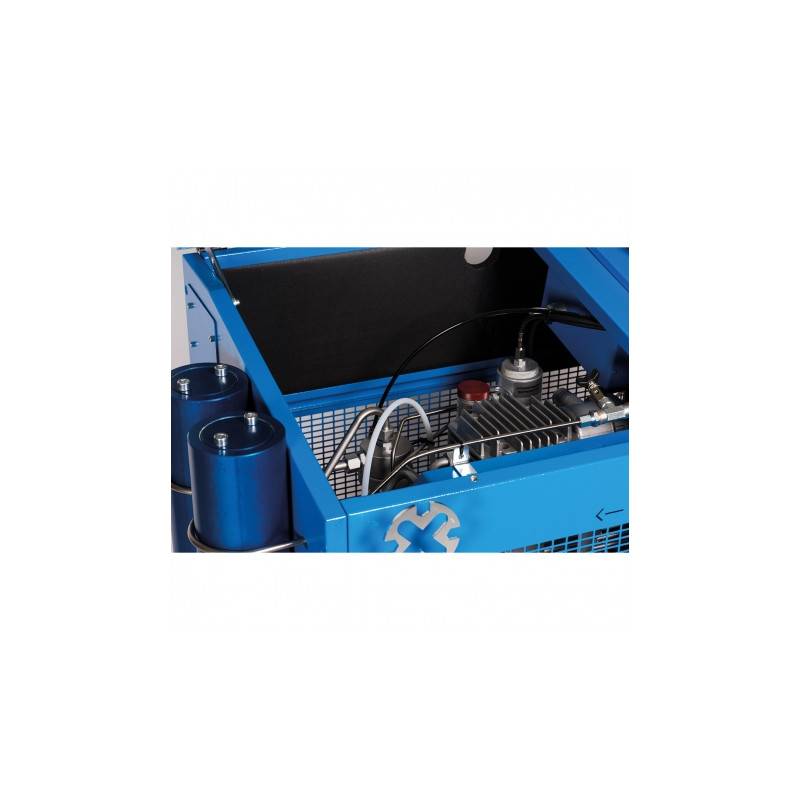 The COMPACT EVO MARK II - Tropical Plus range has been designed to meet the following requirements: an uncompromising compressor for intensive use, hot environments (poorly ventilated rooms or tropical countries), oversized cooling and control systems for efficient monitoring of compressor operation. Equipped with 2 flexible inflation outlets at the front, inter-stage pressure gauges, oil level and ventilation air temperature safety device, direction of rotation detector, drive motor, robust compressor block with oil pump and oil filter, automatic bleed valves and an electrical cabinet managing the automatic shutdown of the compressor.