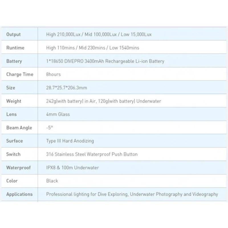 Thanks to its 5° angle and 210,000Lx output, the Divepro MP30 is ideal for illuminating small subjects.