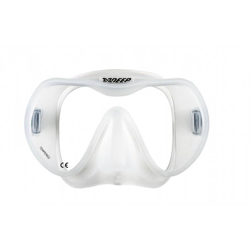Transparent silicone. With no contour, this mask offers a very wide field of vision. Tempered glass, CE-approved.