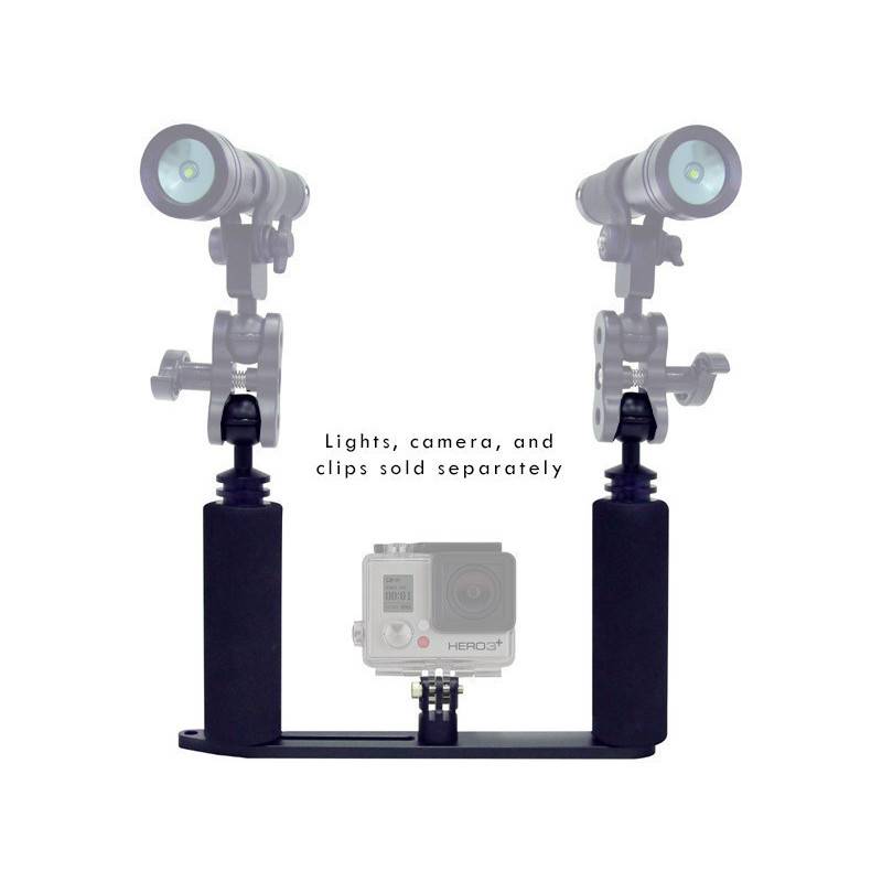 Grâce à cette platine plongée pour camera GoPro, vous disposez d'un modèle permettant la fixation de deux phares grâce à ses deux bras.