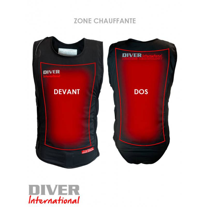 Le gilet chauffant est unique car c'est le seul du marché à permettre de plonger en combinaison humide. Il se compose d'un gilet unisexe 100% polyester avec intérieur polaire. Il est particulièrement fin et couvre du dos aux reins à l'arrière et de la poitrine au ventre à l'avant.