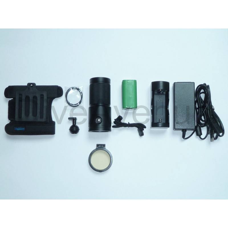 La très forte intensité de cette lampe de plongée à led hyper compacte est de 10000 Lumens à 120°. Il dispose également de 6x leds rouges CREE XPE pour la mise au point ou en plongée de nuit.