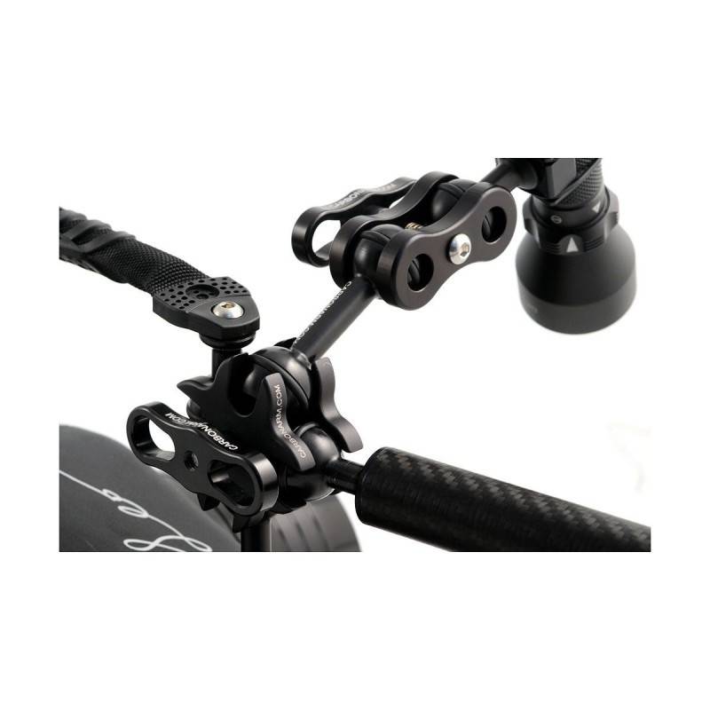 Carbonarm utilise seulement 100% de fibre de carbone «Made in Italy» pour garantir une résistance extraordinaire à l'usure et l'eau de mer, avec un poids très faible. La qualité des tubes en fibre de carbone que nous avons choisie pour nos bras est très élevée, comme en témoigne la beauté du tissage. Les rotules sont en aluminium anticorodal, anodisé à 40 microns et possèdent un joint torique pour faciliter l’adhérence avec les pinces. Les rotules sont collées au tube de carbone avec une colle spéciale, assurant ainsi une étanchéité jusqu’à 150 mètres de profondeur.