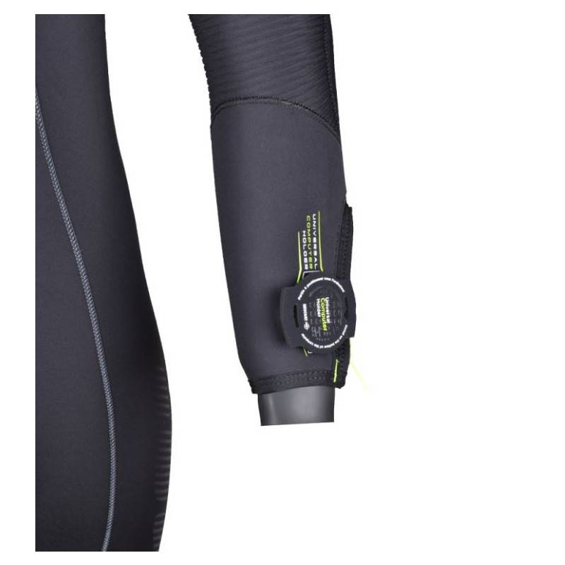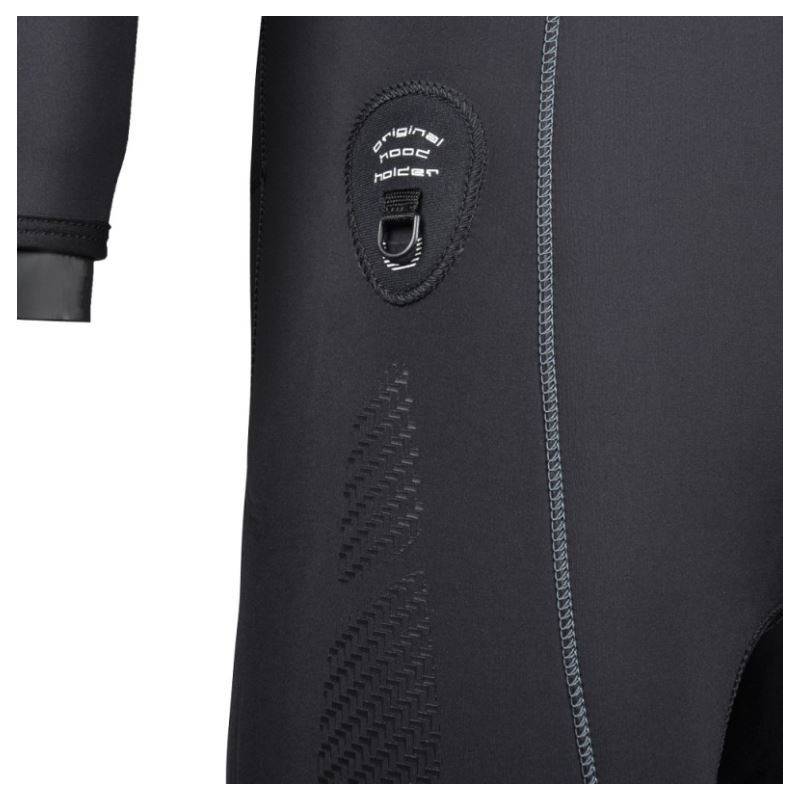 - Manchon visage aminci (-2 mm) sur la monopièce col avec une zone autour du visage sans couture pour plus de confort, d'étanchéité et de durabilité. Col lisse intérieur pour plus d'étanchéité et fermeture finement ajustable grâce à un scratch élastique et un grip non agressif qui ne s'agrippe pas sur le jersey et les coutures. Double manchon poignet et cheville zippé avec manchon intérieur à retourner, en jersey intérieur et néoprène lisse extérieur. L'extrémité de la couture d'assemblage des manchons intérieurs est coupée à 45° pour plus d'élasticité et de solidité lors de l'habillage.
