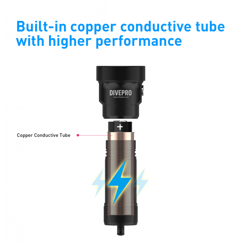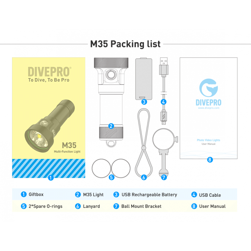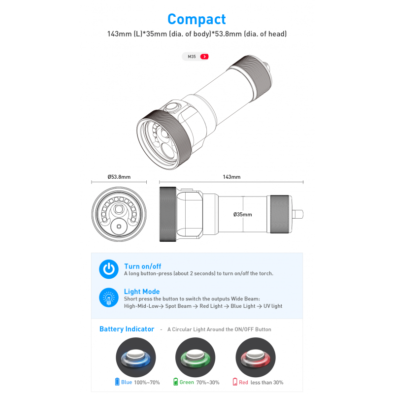 La lampe de plongée d'exploration DIVEPRO M35 est étanche à 100m de profondeur et est très compacte avec 143mm de long et 54mm de diamètre à l'avant, 35mm à l'arrière.