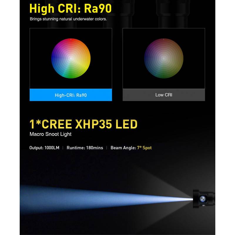 L'angle de faisceau est de 90° dans l'eau pour le 3500Lm et 7° pour le faisceau 1000Lm. Grâce à sa température de couleur est de 5000°K et son CRI Ra90, le vidéaste sous-marin appréciera le rendu des couleurs attendues.