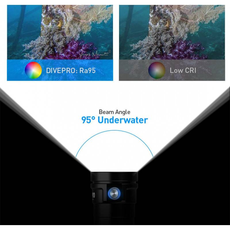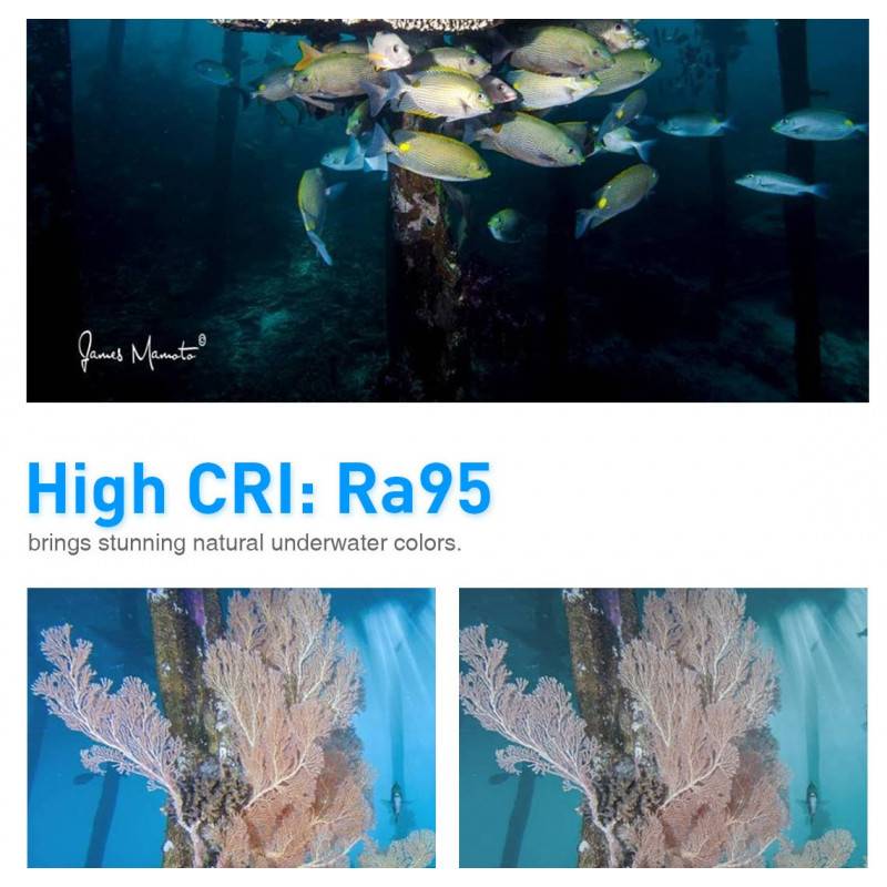 L'angle de faisceau est de 95° dans l'eau (140° dans l'air). Grâce à sa température de couleur est de 5000°K et son CRI Ra95, il rendra au vidéaste sous-marin toutes les couleurs attendues.