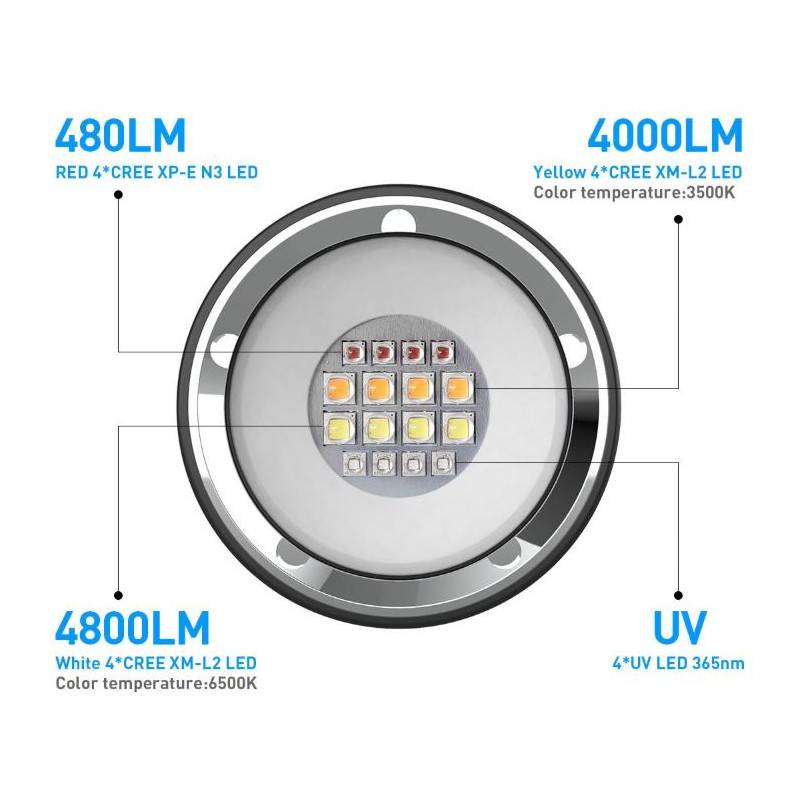 Le phare de plongée DIVEPRO D80F est un phare de plongée vidéo conçu pour les vidéastes sous-marins qui souhaitent varier puissance et température de couleur, la photo UV et les leds rouges.