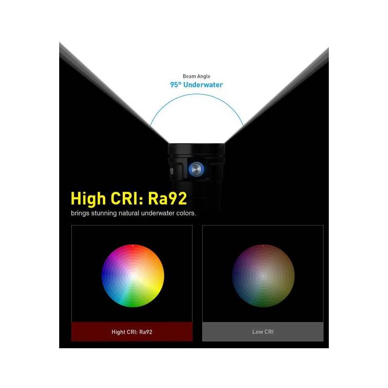 L'angle de faisceau est de 95° dans l'eau (140° dans l'air). Sa température de couleur chaude est de 5000°K et son CRI Ra92, il rendra au vidéaste sous-marin toutes les couleurs attendues.