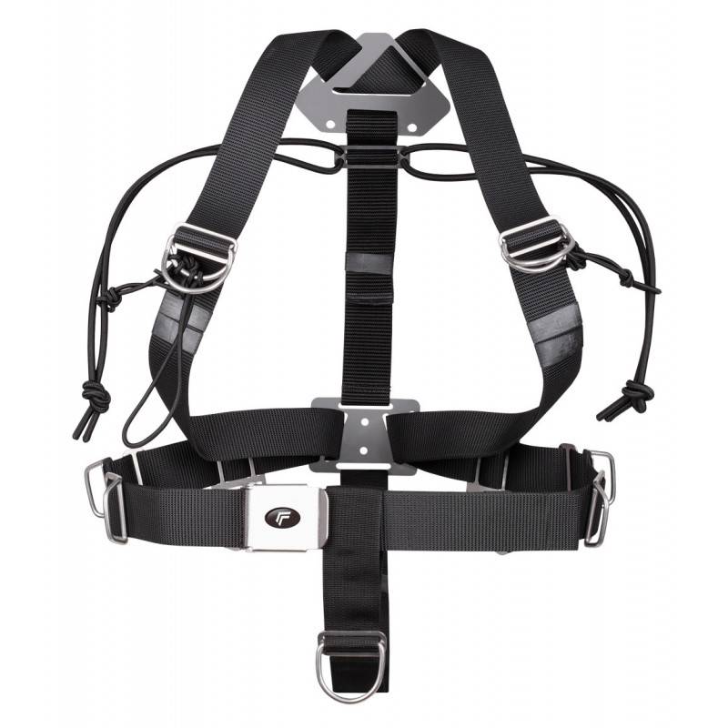 Le harnais est réalisé à l'aide d'une bande de 50mm de largeur et existe en montage DIR ou école avec sangles réglables. Il dispose d'une sou-cutale et de crochets ceinture de grande taille latéralement pour fixer les bouteilles.