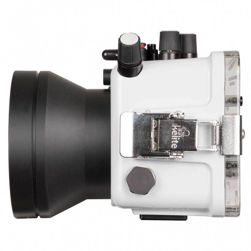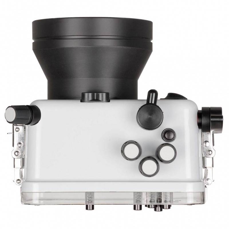 - Caisson nouveau design en polycarbonate gris et porte arrière transparente permettant une vérification de la bonne position du boîtier photo et des leviers de commande dans le caisson ; très résistant, il est testé et utilisable jusqu'à une profondeur de 60 mètres. La couleur grise spécialement formulée reflète les rayons du soleil pour garder l'appareil photo plus frais dans le temps. Par rapport aux caissons de couleur noire ou transparent, la couleur grise offre un contraste supérieur pour une meilleure visualisation de l'écran LCD.