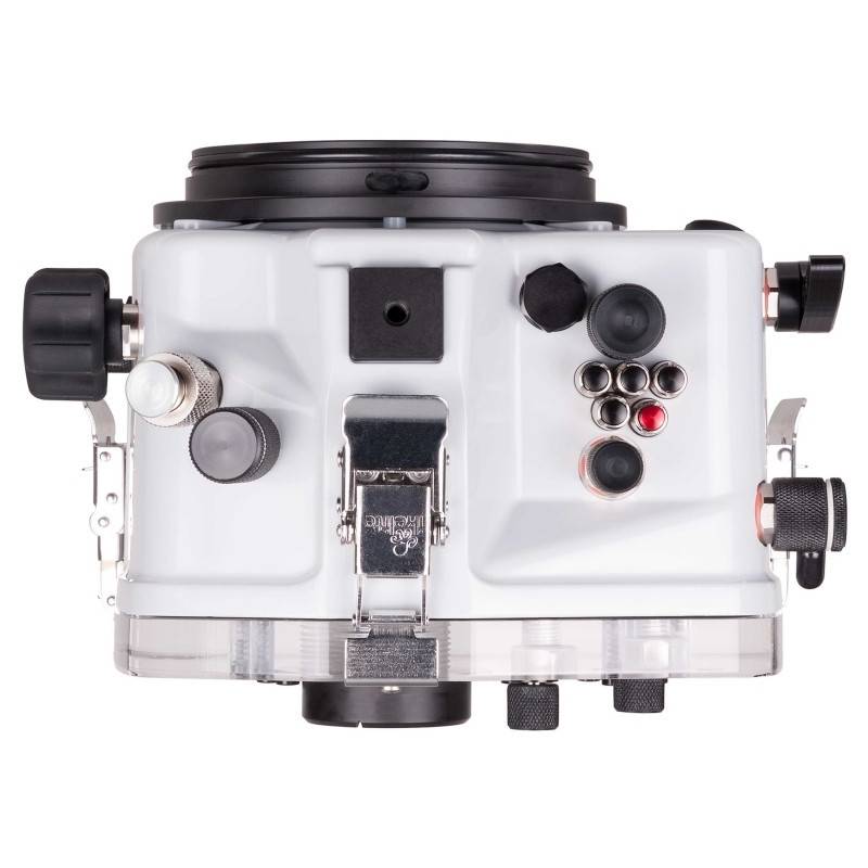 - Une prise flash, par l'intermédiaire d'un raccord étanche, permet l'utilisation d'un flash externe TTL de la gamme Ikelite, DS51, 125, 160, 161 . La liaison par câble de synchronisation inhibe le déclenchement du flash interne de l'appareil photo et permet ainsi de gagner considérablement en autonomie.