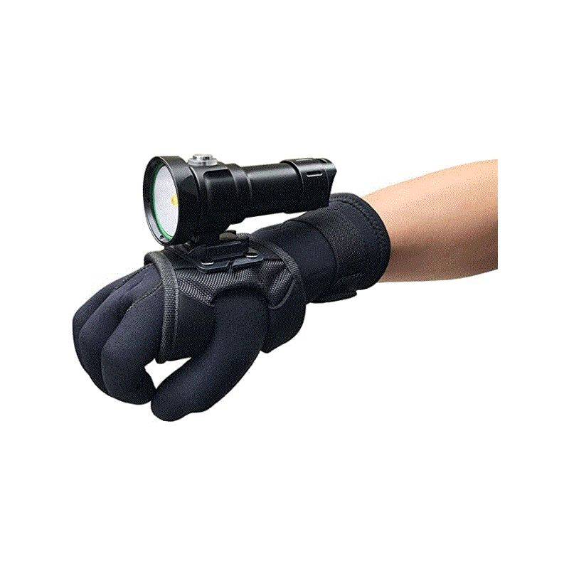 La poignée Goodman permet de fixer un phare DIVEPRO sur le dos de la main et permet ainsi d'avoir les mains libres.