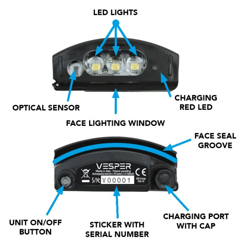 Sa taille réduite et son placement en instance de brevet à l'intérieur du masque donnent lieu à une unité qui augmente la flottabilité négative du système tout en étant incroyablement confortable. Le Vesper est : plus petit, plus léger que le VL, ne nécessite ni adhésif ni vis, peut être installé par l'utilisateur final sans formation, se recharge via USB, dispose d'un capteur infrarouge, d'un mode SOS et d'un boîtier polyvalent, l' objectif de cet étui est de protéger l'appareil lors du stockage et du transport.