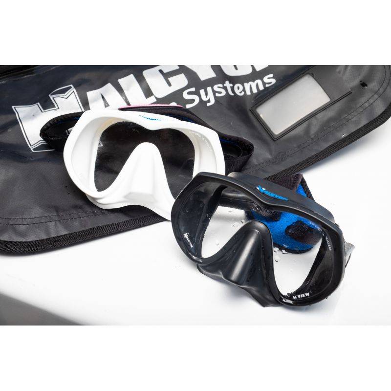 Le masque H-View est livré dans un étui de protection en plastique dur et comporte deux boucles de sangle de masque de la marque Halcyon, compatibles avec les sangles de masque en néoprène Halcyon.