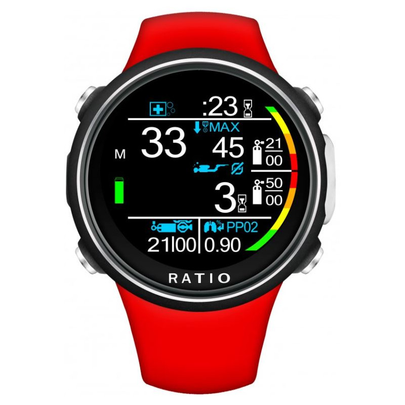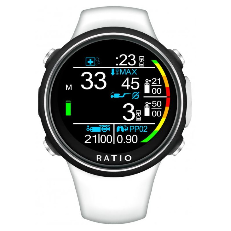 La montre-ordinateur iDive Color Easy de Ratio est conçue pour les modes de plongée Air / Nitrox / Apnée / profondimètre. Il sait gérer deux mélanges AIR/Nitrox. Il intègre l'algorithme de calcul Buhlmann ZHL-16B en temps réel et permet 6x niveaux d'ajustement en plongée.