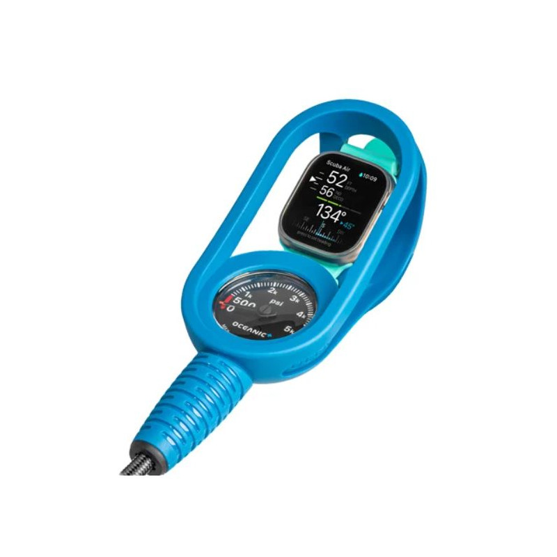 Vous souhaitez ajouter la surveillance de la pression de la bouteille à côté de votre Apple Watch Ultra ? Notre console unique Oceanic+ maintient votre montre en toute sécurité à côté des informations de votre manomètre, de sorte que tout est au même endroit ; facile à utiliser et à suivre pendant la plongée.
