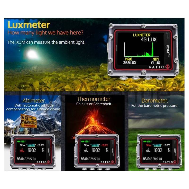 Une multitude de fonctions sont intégrées à l'ordinateur de plongée Ratio iX3M [Pro] Easy comme la personnalisation des couleurs, boussole (utilisable sous l'eau) avec la distance parcourue, prévision météo, magnétomètre, luxmètre, altimètre, thermomètre, baromètre, chronomètre, variomètre....