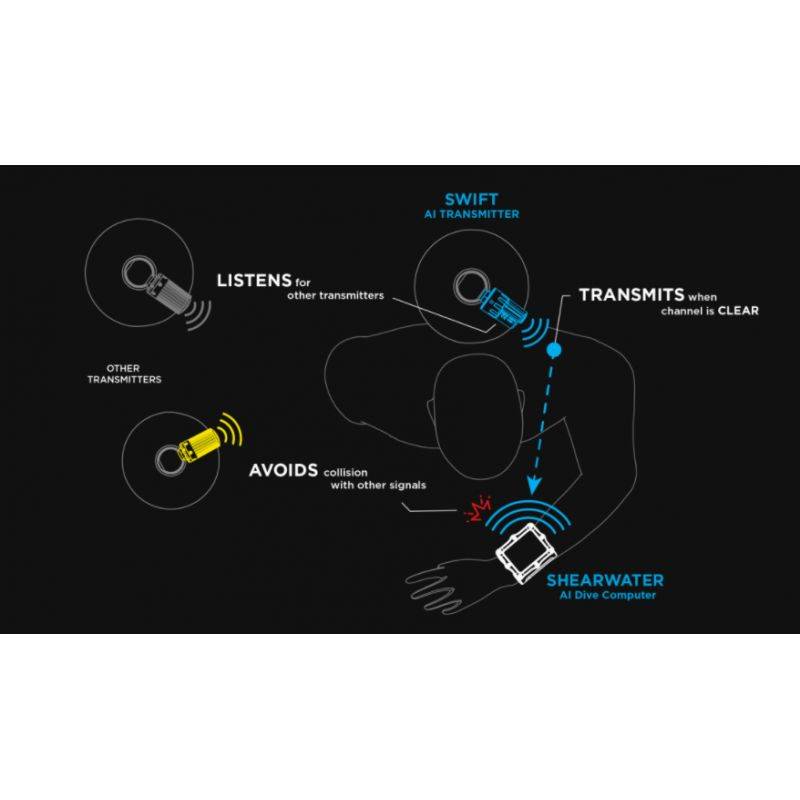 Le nouveau transmetteur de pression SHEARWATER Swift a été conçu avec une nouvelle technologie par Intelligence Artificielle. En effet, le Swift "écoute" les émetteurs de pression environnants, avant de générer la fréquence de son propre signal et éviter ainsi les interférences. Il n'y a donc plus besoin de choisir une couleur particulière d'émetteur en cas d'usage multiple.