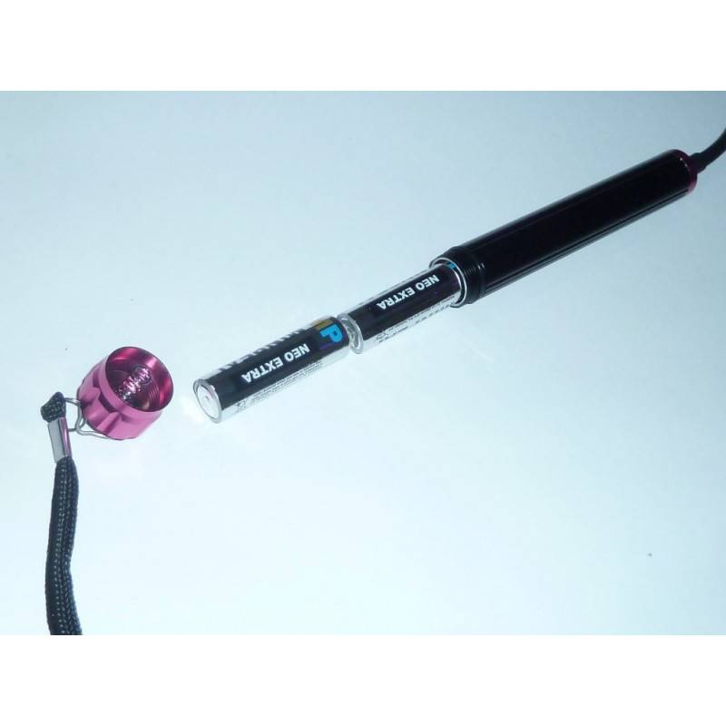 Fonctionne avec deux piles AA. Pour éteindre et allumer la LED il suffit de visser et dévisser la arrière arrière de la lampe.