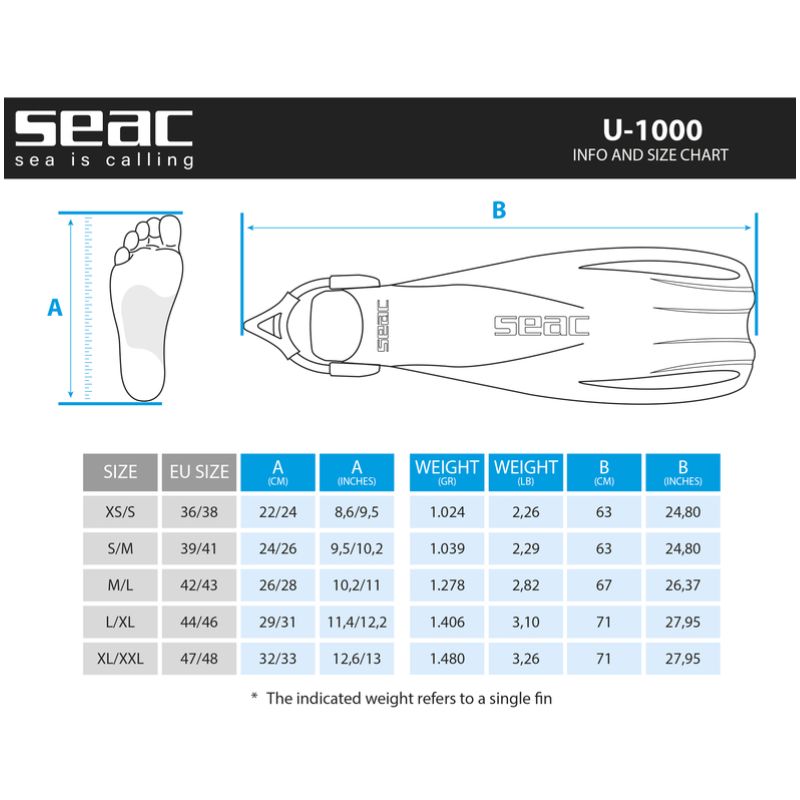 Les palmes SEAC U-1000 s sont fabriquées à partir d’un polymère thermoplastique exclusif, garantissant une résistance aux chocs et frottements.