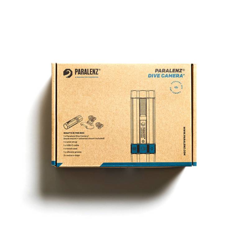 La camera sous-marine 4K PARALENZ+ étanche à 250m est fournie avec un support de masque, un support universel, une lanière, un cable USB de chargement, une boîte de rangement.